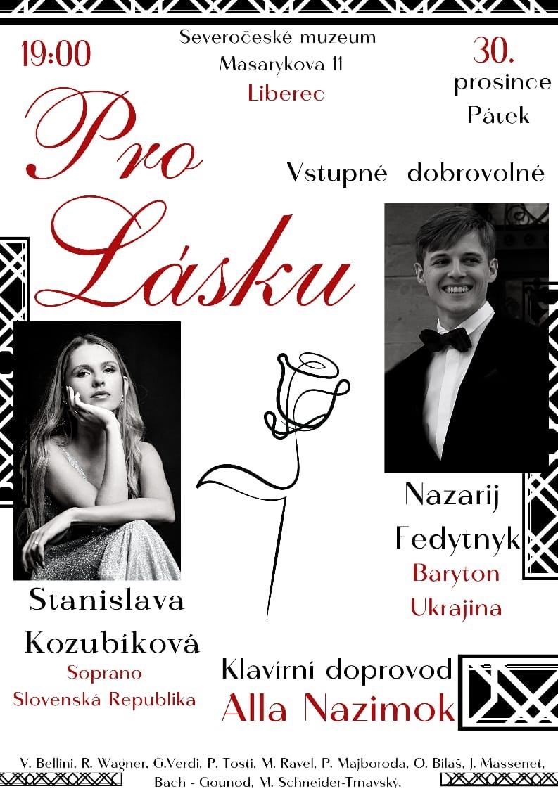 Na závěr letošního roku jsme pro vás připravili koncert dvou zpěváků, Nazariye Fedytnyka z Ukrajiny a Stanislavy Kozubíkové ze Slovenska. Na klavír je doprovodí Alla Nazimok. Přijďte se zaposlouchat do krásných melodií Verdiho, Wagnera, Ravela a dalších známých skladatelů. Těšíme se na vás v pátek 30. prosince v 19 hodin. Vstupné na koncert je dobrovolné.